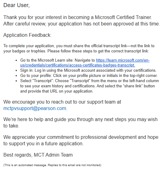 前回よりも文章が長いから、進展はあったようで、「申請を完了するにはバッジやトロフィーへのリンクではなく、公式の成績証明書のリンクを共有せよ」とのことだった。